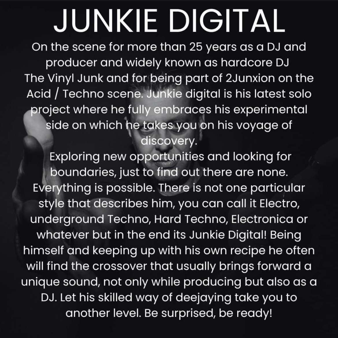 Under the name Junkie Digital, the sound shifts into a more futuristic space. Driving techno, layered textures, and immersive, high-energy sets define this side of the spectrum. Precision meets intensity, with a strong emphasis on progression and atmosphere—built for late nights and deep dancefloor connection.
