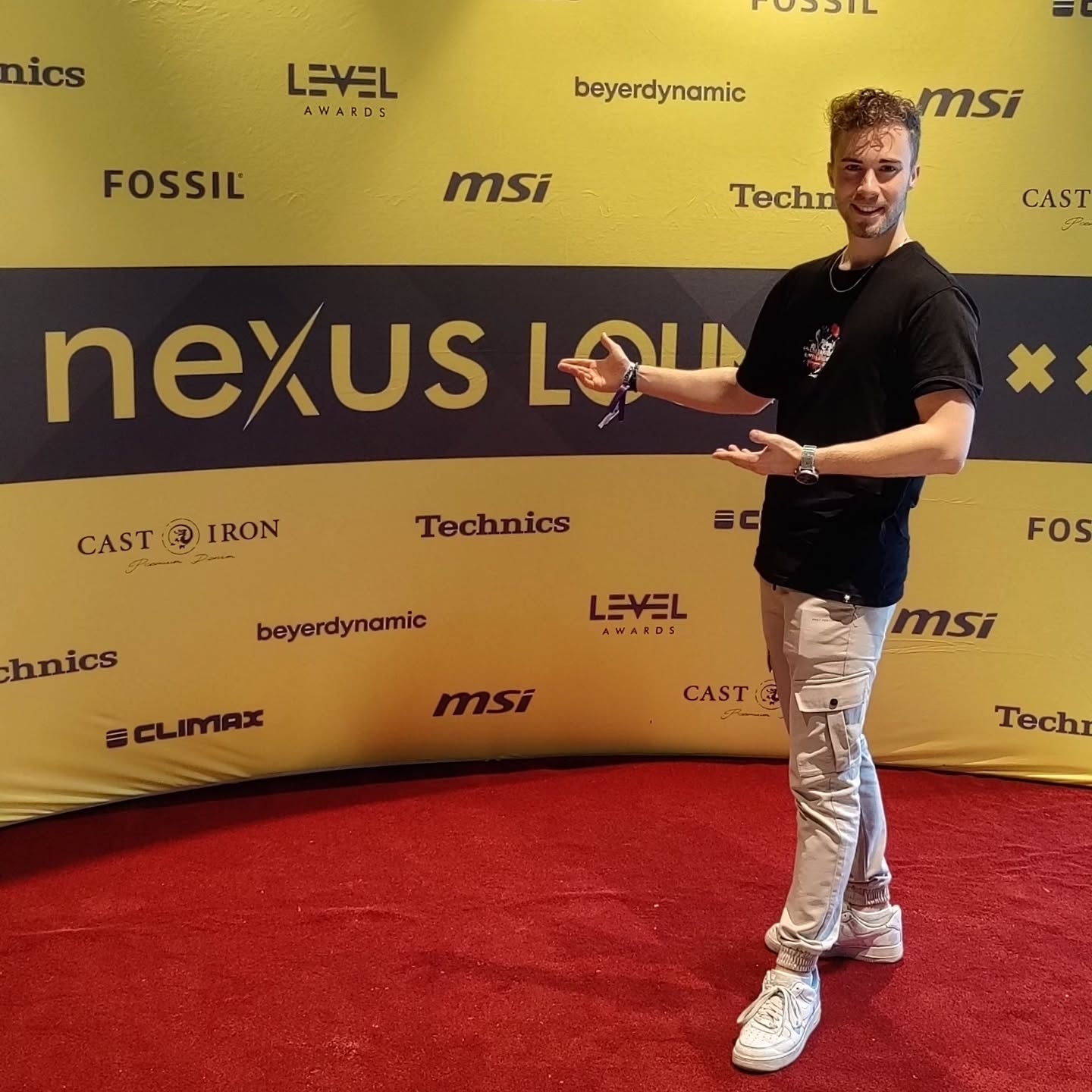 [SWIPE] After a two-week holiday in Spain 🇪🇸, I'm back performing as a DJ and violinist 🎧🎻 Photos and videos taken from the last event in Venray, Netherlands. It was great to have some visuals with my name and logo on the stage @cafemomentvenray